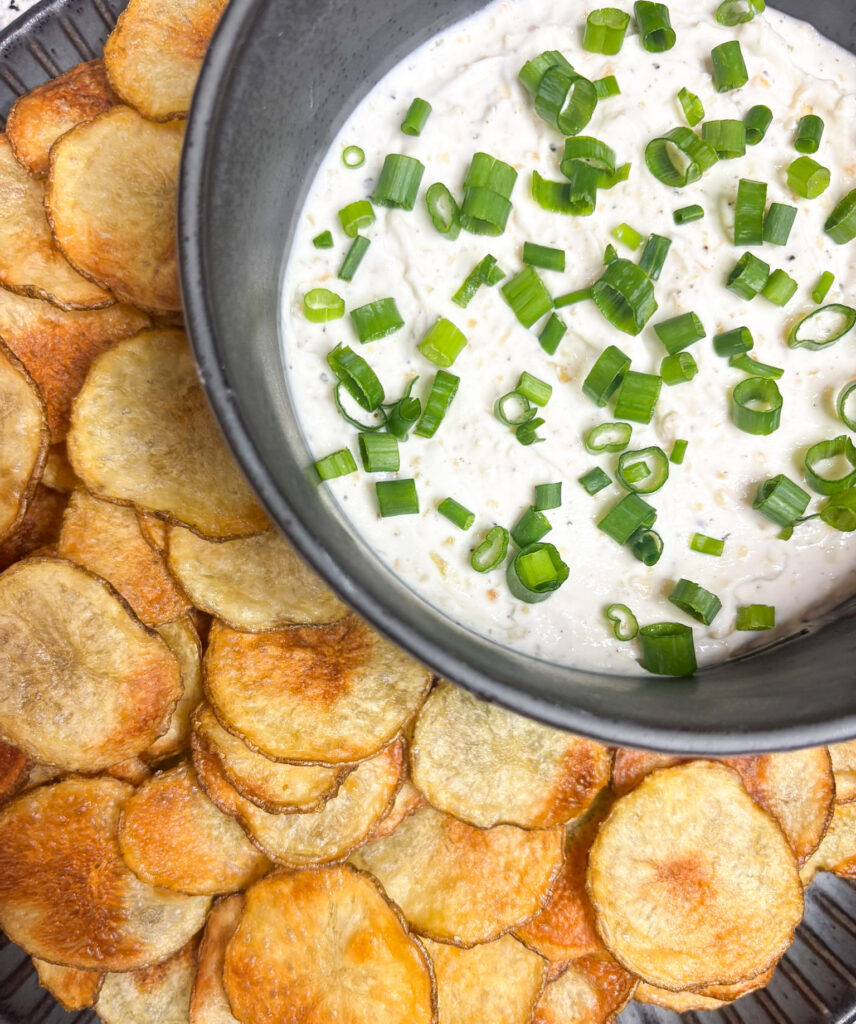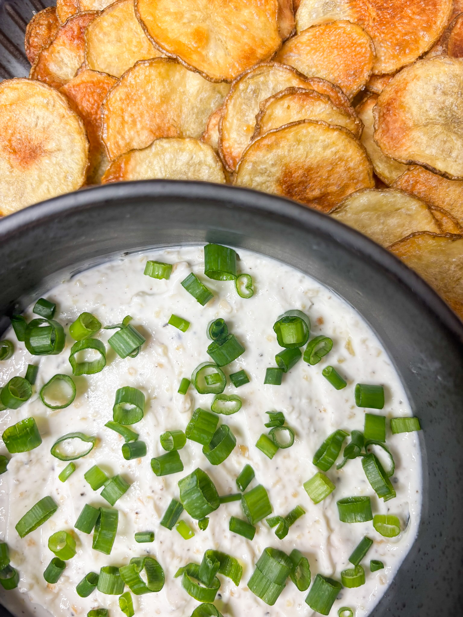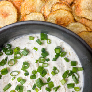 One very important note for this recipe is that the dried onion flakes soften and get stronger in flavor the longer the dip sits in the fridge. If you’re serving it right away, you can add lots of onion flakes and adjust the flavor to taste. But if you plan on making this dip even an hour in advance, I highly recommend starting with less (as little as 1-2 teaspoons), then adding more once you’re ready to serve.