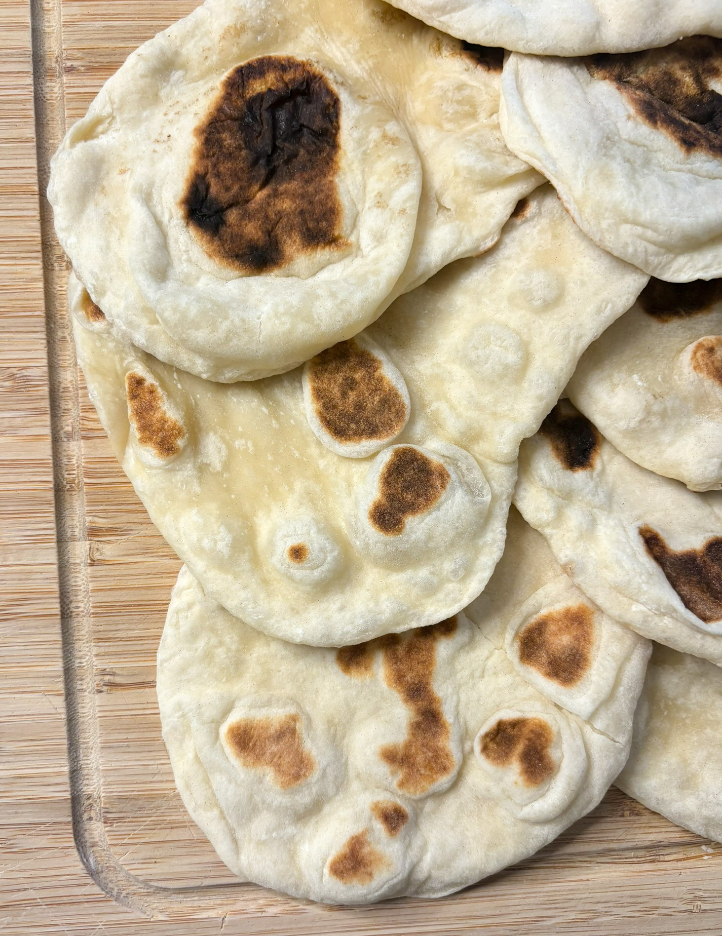 Homemade flatbread is almost always better than any store-bought version. It’s fresher, softer and often made with cleaner ingredients. In this case, a total of 4 ingredients: flour, baking powder, salt and Greek yogurt, which gives them a little extra boost of protein and tanginess.