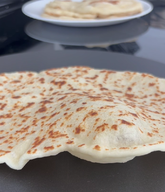 • When the skillet is evenly heated, add the first dough round and cook for 1 minute, then flip and cook for an additional 30-45 seconds until bubbly and golden (see Note 1)