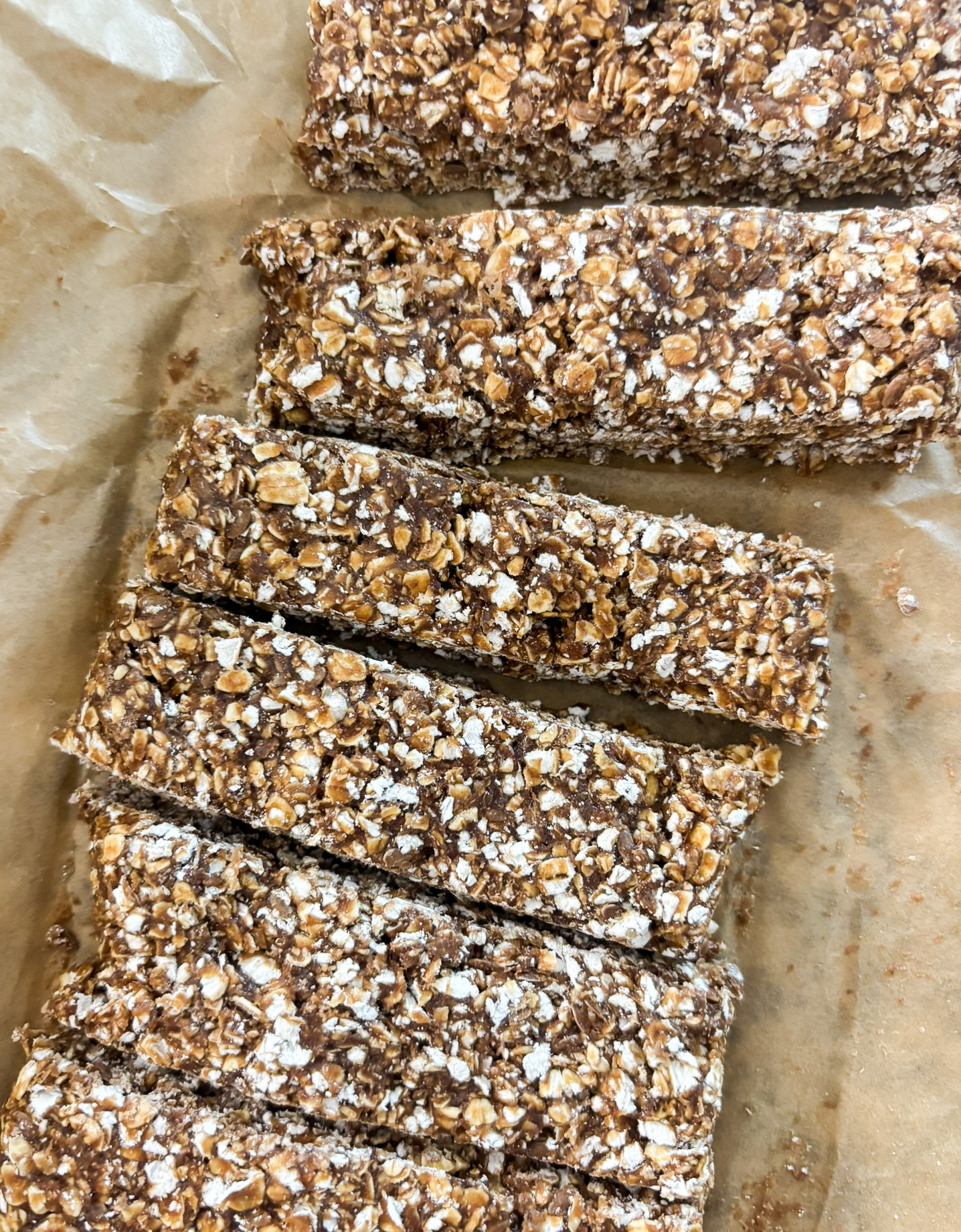 - Slice into 8 equal bars – you can also shape these into balls but I recommend a cookie scoop or gloves because it's super sticky!